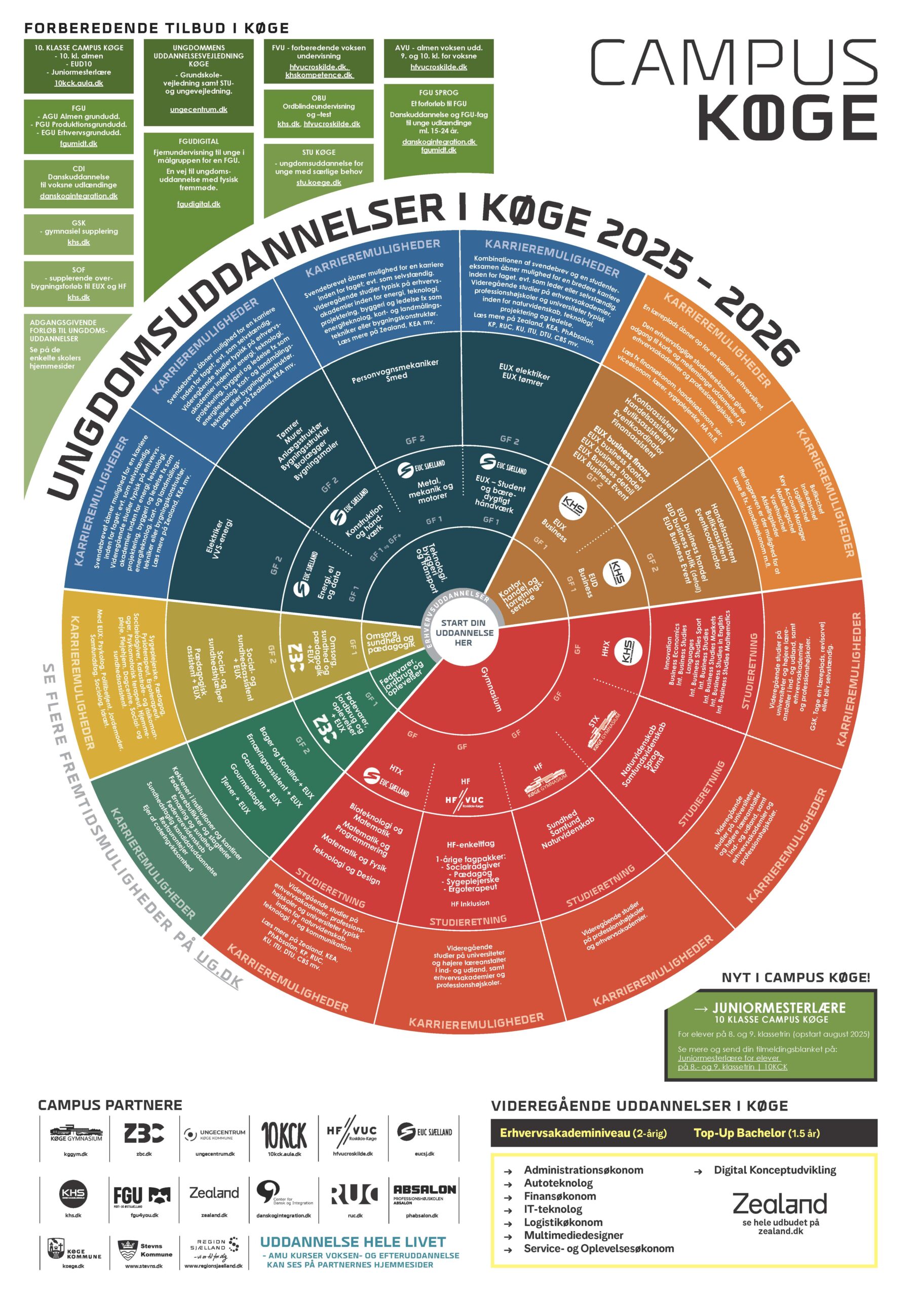 I CAMPUS Køge har vi et stort udbud af uddannelser. Vi favner bredt inden for ungdomsuddannelser og videregående uddannelser. Se i uddannelseshjulet herunder, hvilke uddannelser du kan tage hos os.